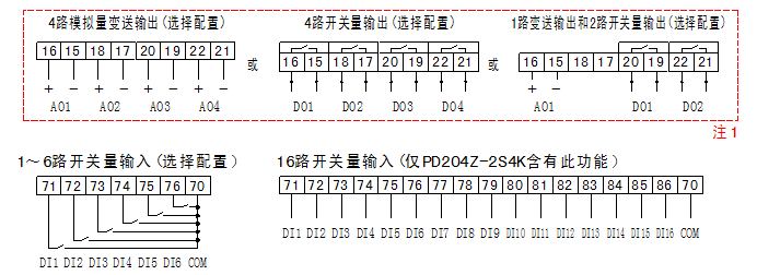 注1:由于接線端子的局限,網絡電力儀表4路模擬量輸出和4路開關量輸出端子是復用的,一般不可以同時選4AO及4DO,可選4AO或4DO或1AO/2DO組合,用戶可根據需要進行選用。