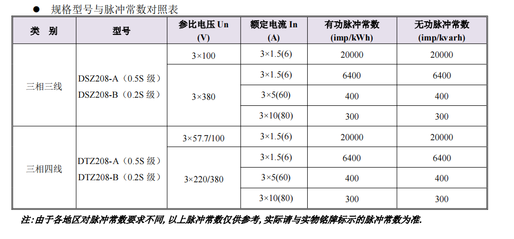 | 3 x 57.7V/100V | 3 x 1.5(6)A | DTS208Y | 測(cè)量三相有功電能,精度1.0級(jí)(對(duì)應(yīng)新國(guó)標(biāo)B級(jí)),具有紅外、RS485接口,三相四線 | ||